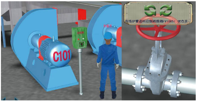 按實際現(xiàn)場設備的外形、尺寸、顏色、位置關系及距離、管線連接方式、音響效果等物理屬性建立3D場景和設施,包括防火堤、滅火器、消防水炮等各種安全設施。