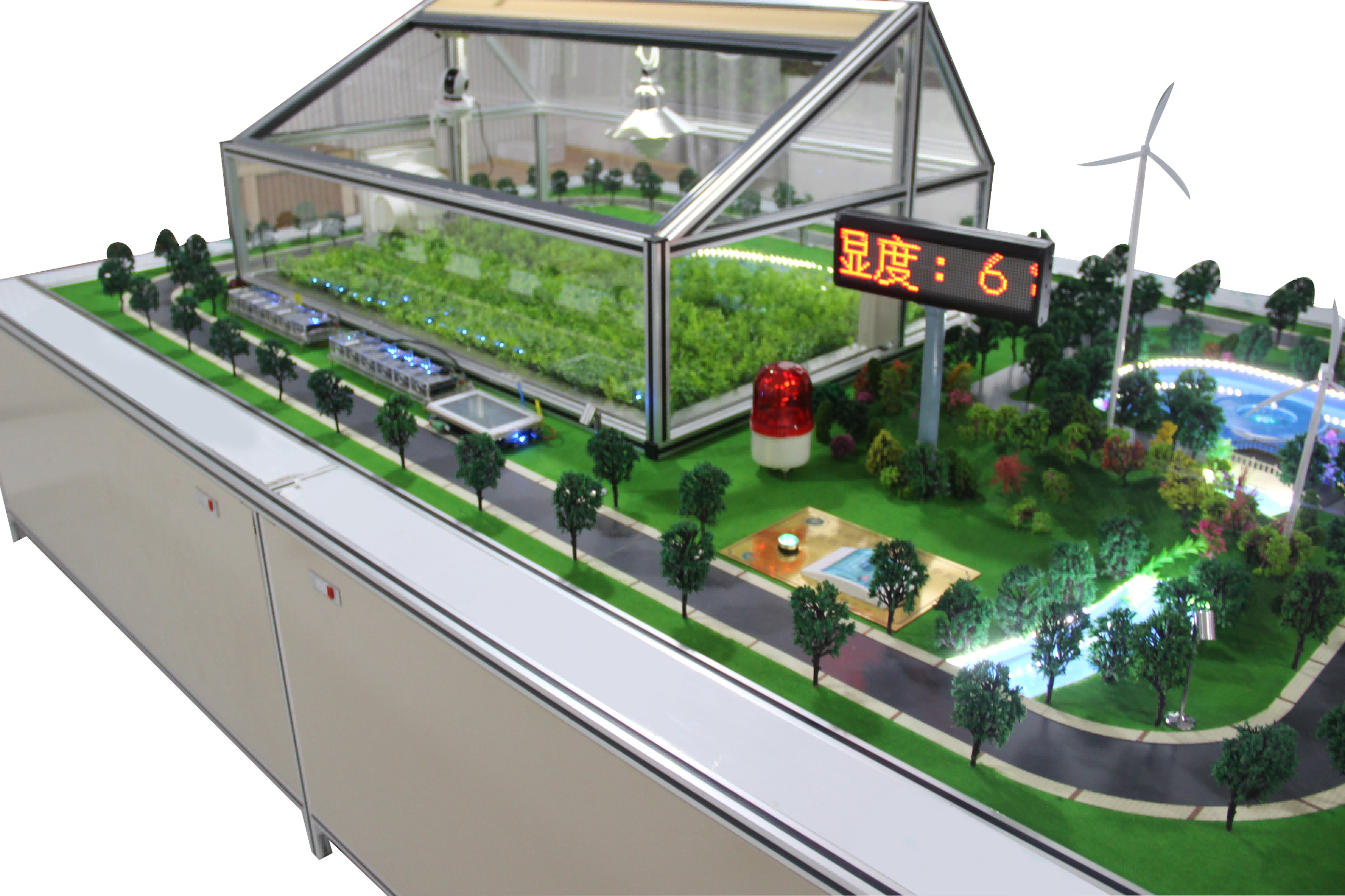 主體采用一個(gè)鋁合金金屬骨架和有機(jī)玻璃墻壁組成的農(nóng)業(yè)大棚,與智能網(wǎng)關(guān)、感知節(jié)點(diǎn)、控制設(shè)備以及執(zhí)行系統(tǒng)一起,構(gòu)成完整的農(nóng)業(yè)大棚系統(tǒng),包括:透明溫濕度大棚、自動(dòng)遮陽罩、水泵及噴頭、仿真植物和真實(shí)植物、水循環(huán)系統(tǒng)、通風(fēng)系統(tǒng)、光照調(diào)節(jié)系統(tǒng)、溫度調(diào)節(jié)系統(tǒng)、無線傳感器網(wǎng)絡(luò)設(shè)備等。