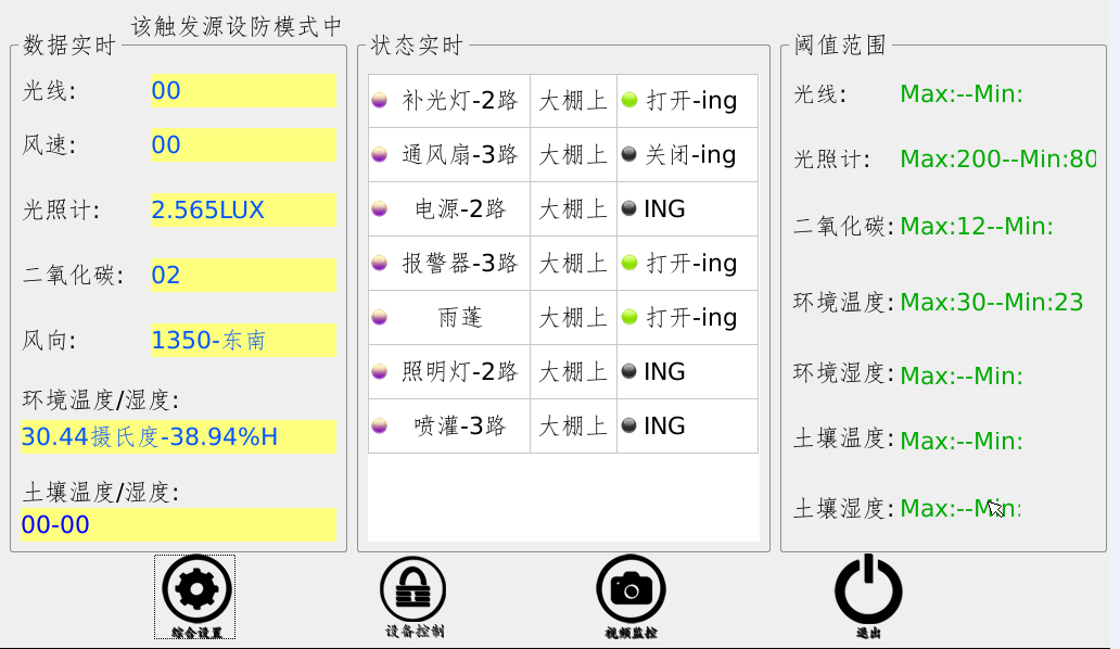具有傳感器與執(zhí)行器的聯(lián)動(dòng)設(shè)置功能。設(shè)置傳感器的上、下限值,以及當(dāng)傳感器采樣低至下限或高至上限時(shí),執(zhí)行器的動(dòng)作,可實(shí)現(xiàn):(1)大棚內(nèi)溫度自動(dòng)調(diào)節(jié)功能,(2)大棚濕度自動(dòng)調(diào)節(jié)功能,(3)土壤濕度自動(dòng)調(diào)節(jié)功能,(4)光照強(qiáng)度自動(dòng)調(diào)節(jié),(5)大棚CO2濃度自動(dòng)調(diào)節(jié)等功能。