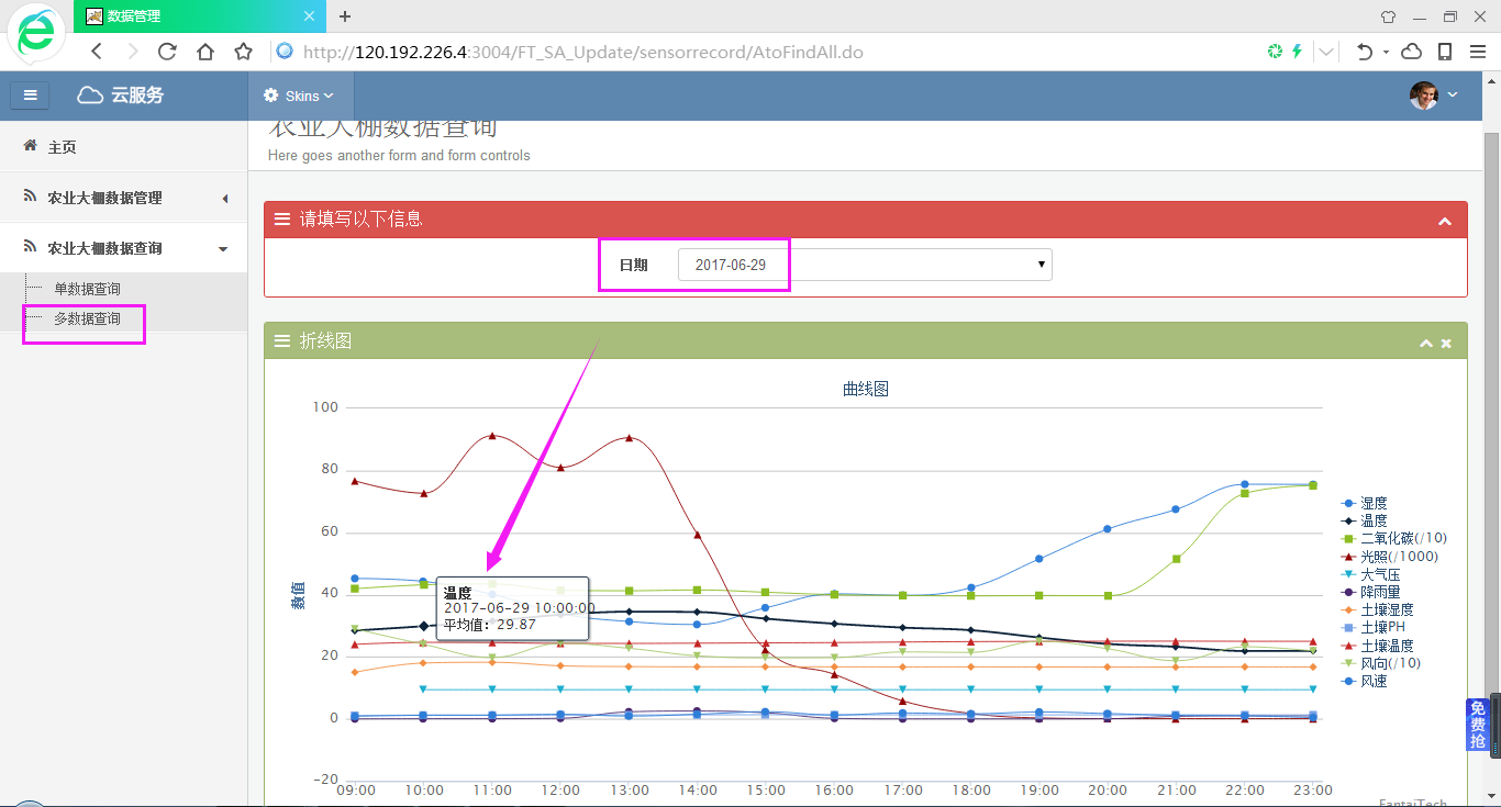 具有用戶登錄、大棚網(wǎng)關(guān)設(shè)備的增刪改查、傳感器設(shè)備的增刪改查、傳感器采樣數(shù)據(jù)的實(shí)時(shí)顯示、執(zhí)行器的手動(dòng)開關(guān)、農(nóng)業(yè)場景自控策略設(shè)置、報(bào)警記錄查詢、歷史數(shù)據(jù)按照時(shí)間段以表格/曲線方式展示、數(shù)據(jù)導(dǎo)出excel文件、IP/關(guān)鍵詞地圖定位等功能,還具有服務(wù)器地址編輯和自動(dòng)切換功能。