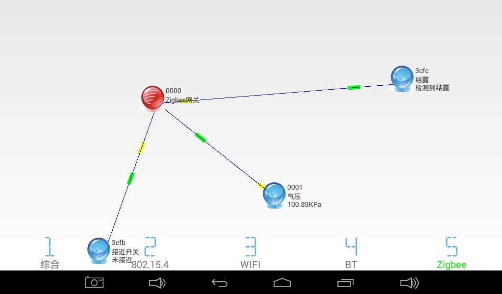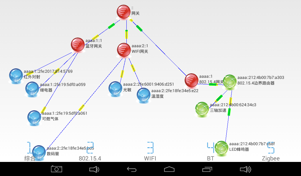 網(wǎng)關(guān)應(yīng)用軟件通過(guò)CoAP服務(wù)和串口服務(wù),將WiFi、藍(lán)牙、IEEE802.15.4、以及ZigBee感控節(jié)點(diǎn)數(shù)據(jù)解析處理,在網(wǎng)關(guān)的Mesh拓?fù)鋱D中實(shí)時(shí)流動(dòng)地顯示傳感器數(shù)據(jù)的上、下行走向;