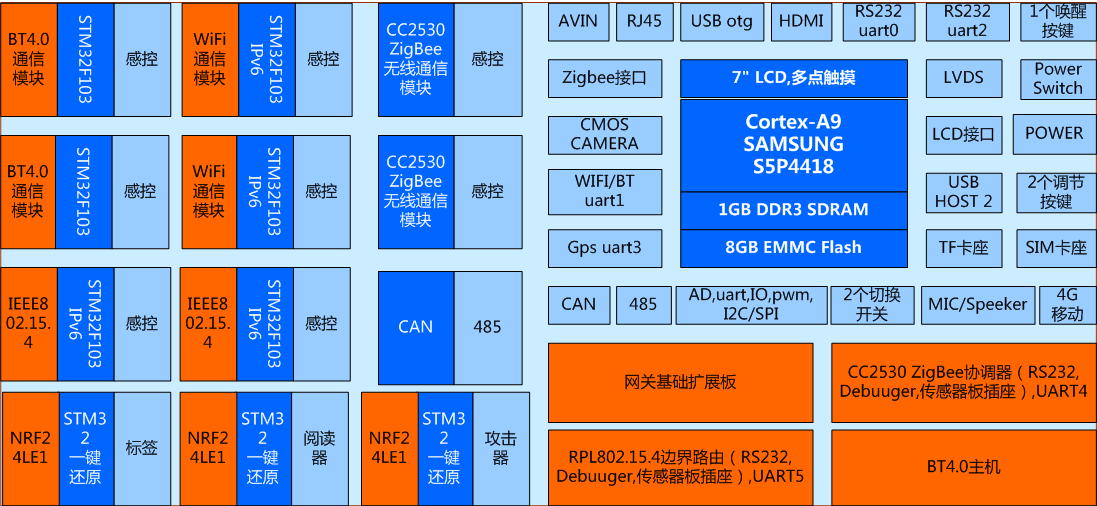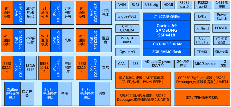 一、整體要求 1)能夠滿足單片機(jī)接口及應(yīng)用、傳感器接口及應(yīng)用、無(wú)線傳感網(wǎng)、嵌入式操作系統(tǒng)開(kāi)發(fā)、嵌入式Linux應(yīng)用開(kāi)發(fā)、Android移動(dòng)應(yīng)用開(kāi)發(fā)等課程要求。 2)能夠組建藍(lán)牙、WiFi、IEEE802.15.4、ZigBee四種無(wú)線網(wǎng)絡(luò),實(shí)現(xiàn)數(shù)據(jù)的無(wú)線傳輸; 3)能夠?qū)⑺{(lán)牙、WiFi、IEEE802.15.4無(wú)線網(wǎng)絡(luò)經(jīng)IPV6協(xié)議、Zigbee節(jié)點(diǎn)經(jīng)ZStack協(xié)議融合在一個(gè)拓?fù)鋱D中,在界面上顯示藍(lán)牙、WiFi、RPL802.15.4、ZigBee等節(jié)點(diǎn)的傳感器數(shù)據(jù)或執(zhí)行器狀態(tài),并實(shí)時(shí)流動(dòng)地顯示各個(gè)傳感器數(shù)據(jù)的上、下行走向; 4)要求藍(lán)牙、WiFi、IEEE802.15.4三種傳感器節(jié)點(diǎn)均具有唯一的IPv6地址,統(tǒng)一采用IPv6協(xié)議組包通信。 5)要求網(wǎng)關(guān)支持Linux、Android雙操作系統(tǒng),支持一鍵燒寫、一鍵切換。 6)要求在保證網(wǎng)關(guān)接入互聯(lián)網(wǎng)的前提下,能夠配置接入云服務(wù)平臺(tái),并實(shí)現(xiàn)移動(dòng)端傳感器數(shù)據(jù)的采集顯示和執(zhí)行器的遠(yuǎn)程控制。 二、硬件資源 1.Cortex-A9網(wǎng)關(guān)(1個(gè)) 1)核心板資源: (1)CPU:Cortex-A9四核心的Samsung s5p4418,主頻1.4GHz; (2)GPU:MAIL-400,3D圖形加速 (3)內(nèi)存: 1GB DDR3; (4)EMMC: 8GB; (5)核心板+底板設(shè)計(jì):核心板加裝屏蔽罩,郵票孔方式與底板連接,抗干擾能力更強(qiáng),比插針式更穩(wěn)定可靠。要求引出核心板信號(hào)線,不少于188PIN。 2)網(wǎng)關(guān)主板資源: (1)LCD接口:7寸IPS電容屏(16:9),分辨率1024×600; (2)USB接口:2路USB_HOST 2.0輸出,1路USB OTG; (3)Ethernet接口:核心板內(nèi)置千兆IP,外加不超過(guò)3RMB的PHY芯片即可,支持10/100/1000M,RJ45接口; (4) 串口:2路3線RS232,1路TTL接口,1路RS485,1路Bluetooth; (5)CAN總線接口:1路; (6)RS485總線接口:1路; (7)HDMI 接口:HDMI1.4a,*大支持1920*1080高清數(shù)字輸出; (8)LVDS液晶屏接口:?jiǎn)瓮ǖ溃?大支持1920*1080; (9)攝像頭接口:1路CMOS并行接口,*大支持800萬(wàn)像素; (10)AV接口:1路模擬視頻母口輸入; (11)外部存儲(chǔ)擴(kuò)展接口:SD卡、TF卡接口; (12)音頻接口: 1路MIC輸入,1路1. 8w喇叭; (13)按鍵:1個(gè)復(fù)位按鍵、1個(gè)休眠喚醒按鍵,2個(gè)音量鍵; (14) 藍(lán)牙WiFi:板載藍(lán)牙WiFi二合一模塊; (15)Mini PCIe接口:標(biāo)準(zhǔn)可插入4G通信模模塊; (16)24Pins應(yīng)用擴(kuò)展接口:用于處理器外設(shè)接口擴(kuò)展功能,包含3路串口、1路PWM、1路IIC、1路ADC、8個(gè)GPIO,5V電源。 2.網(wǎng)關(guān)IO基礎(chǔ)擴(kuò)展板(1個(gè)) 由網(wǎng)關(guān)直接驅(qū)動(dòng)。采用HC595串入并出特點(diǎn),使用較少IO擴(kuò)展更多功能,默認(rèn)地址0x01。1路可調(diào)電位器模擬AD采樣通道,1路PWM驅(qū)動(dòng)的蜂鳴器,5個(gè)觸摸按鍵,5個(gè)LED指示燈。 3.三路繼電器擴(kuò)展板(1個(gè)) 由網(wǎng)關(guān)直接驅(qū)動(dòng)。采用HC595串入并出特點(diǎn),使用較少IO擴(kuò)展更多功能,默認(rèn)地址0x10。 可控制3路繼電器,線圈機(jī)械式觸點(diǎn),1個(gè)常開(kāi),1個(gè)常閉,*大負(fù)載10A/277V AC。 4. ZigBee協(xié)調(diào)器(1個(gè)) 與網(wǎng)關(guān)的TTL UART連接。采用CC2530單片機(jī)外設(shè)接口、射頻通信與ZStack協(xié)議棧的方案,具備Zigbee建網(wǎng)功能,具有2個(gè)組網(wǎng)狀態(tài)及無(wú)線傳輸指示燈,2個(gè)功能按鍵,提供傳感器模塊接口、RS232接口、調(diào)試下載接口。 5. IEEE802.15.4主機(jī)(1個(gè)) 與網(wǎng)關(guān)的TTL UART連接。采用CC2530射頻功能與802.15.4的從機(jī)組建射頻網(wǎng)絡(luò),接收從機(jī)信息,向從機(jī)發(fā)送命令。具有2個(gè)組網(wǎng)狀態(tài)及無(wú)線傳輸指示燈,2個(gè)功能按鍵,提供傳感器模塊接口、RS232接口、調(diào)試下載接口。 6.無(wú)線傳感網(wǎng)通信節(jié)點(diǎn)(12個(gè)) 1)微控制器主板硬件資源 (1)Cortex-M3核心主板(9個(gè)) 處理器基于ARM Cortex-M3核心的STM32F103,*高主頻72Mhz,內(nèi)部Flash 256KB,RAM 48KB。 具有1個(gè)0.96寸OLED屏,能夠顯示MAC地址、上下級(jí)關(guān)系、傳感器數(shù)據(jù)、網(wǎng)絡(luò)信息等。 具有4個(gè)組網(wǎng)狀態(tài)及無(wú)線傳輸指示燈,2個(gè)功能按鍵、1個(gè)JTAG調(diào)試接口、1個(gè)24PIN的無(wú)線射頻接口,1組20*2PIN傳感器接口; 標(biāo)配ARM仿真器、串口下載仿真調(diào)試轉(zhuǎn)接板。 運(yùn)行IPv6協(xié)議棧實(shí)現(xiàn)無(wú)線通信的功能。 (2)CC2530核心主板(3個(gè)) 處理器基于CC2530F256,具有2個(gè)組網(wǎng)狀態(tài)及無(wú)線傳輸指示燈,2個(gè)功能按鍵、1個(gè)JTAG調(diào)試接口、1個(gè)24PIN的無(wú)線射頻接口,1組20*2PIN傳感器接口; 標(biāo)配下載仿真器。 2)無(wú)線傳感網(wǎng)通信模塊 (1)藍(lán)牙通信模塊(3個(gè)):采用UART接口的內(nèi)置協(xié)議棧方案,設(shè)置從機(jī)模式,與主機(jī)配對(duì)后,將微控制器采樣數(shù)據(jù)傳輸給主機(jī)。 (2)WiFi通信模塊(3個(gè)):采用UART接口的內(nèi)置TCP/UDP/HTTP協(xié)議棧方案,支持設(shè)置為AP、STA的工作模式,與網(wǎng)關(guān)通信后,將微控制器采樣數(shù)據(jù)傳送給主機(jī),或者接收主機(jī)的控制命令控制執(zhí)行器。 (3)IEEE802.15.4通信模塊(3個(gè)):基