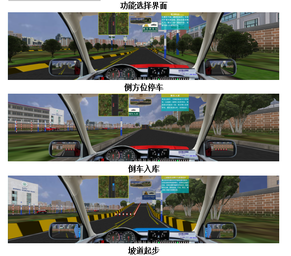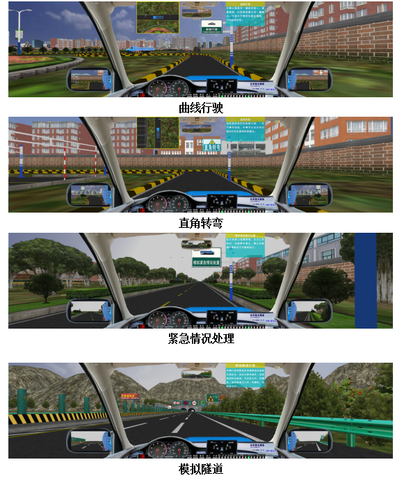 道路場(chǎng)景 | 炫目道路:(朝九晚五的太陽(yáng))炫目會(huì)車,炫目駕駛鄉(xiāng)村道路等。泥濘道路:泥濘洼地道路駕駛(方向、制動(dòng)、驅(qū)動(dòng)有打滑滯后感)場(chǎng)景模型取鄉(xiāng)村道路,道路變?yōu)槟酀魻顟B(tài)。石子路面:汽車在其上面行駛,遇到剎車時(shí)剎不住車,還可汽車還在繼續(xù)滑動(dòng),有時(shí)還會(huì)斜向滑行,極難控制感,汽車在石子路面里滑動(dòng)。涉水道路:涉水駕駛汽車有水流沖力對(duì)車輛的前進(jìn)阻力感光及側(cè)滑感,輪胎與水下的路壓力減小,驅(qū)動(dòng)力受到限制,使行駛受阻感覺(jué)。專項(xiàng)訓(xùn)練:要附合交通部要求。系統(tǒng)評(píng)分:每次駕駛結(jié)束,系統(tǒng)自動(dòng)評(píng)分。山區(qū)到路:突出坡多、彎多、凹凸路面、駕駛環(huán)境復(fù)雜、有側(cè)風(fēng)、有陡坡長(zhǎng)坡、溜坡、側(cè)滑(有語(yǔ)音提示)。鄉(xiāng)村道路:含鐵道路口;加油站,公交車站、單行道、農(nóng)田道口等;城市道路:含公交站臺(tái),高架立交橋、公交專用道、十字路口、丁字路口、環(huán)島、隧道、單行道、雙黃線、加油站、商場(chǎng)百貨門口斑馬線天橋,學(xué)校門口及紅綠燈,行人、非機(jī)動(dòng)車亂穿馬路及非機(jī)動(dòng)車等。高速公路:包括收費(fèi)站(入、停、出、)服務(wù)區(qū)、緊急帶、匝道行駛、超車道、行車道、隧道、立交橋、交通標(biāo)牌標(biāo)線。危險(xiǎn)場(chǎng)景:視線不清的交通情況下,超車后突然切入他人道引起被超車輛緊急制動(dòng)、自行車、行人突然橫穿馬路,路面維修,障礙物繞行等 危險(xiǎn)場(chǎng)景、 | |