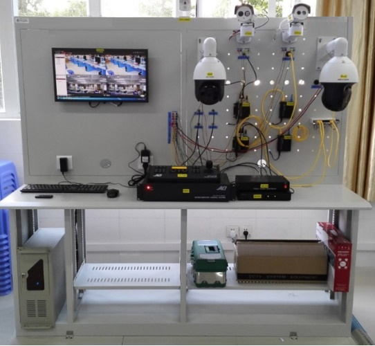 本實訓(xùn)平臺的實現(xiàn)效果如圖1所示,交通視頻處理實驗操作臺整體采用優(yōu)質(zhì)冷軋鋼板作為主體結(jié)構(gòu),臺面防靜電,面板配備各種固定安裝套件以方便嵌入掛鉤進行實驗設(shè)備的安裝固定和穿線維護。實驗臺上能夠搭建的實驗儀器囊括了歷代視頻監(jiān)控攝像機,包括第一代的模擬視頻監(jiān)控系統(tǒng)(CCTV),第二代的基于“PC+多媒體卡”數(shù)字視頻監(jiān)控系統(tǒng)(DVR),第三代的完全基于IP網(wǎng)絡(luò)視頻監(jiān)控系統(tǒng)(IPVS),第四代的是目前正在快速發(fā)展的基于移動互聯(lián)、云計算、云存儲等新技術(shù)的視頻監(jiān)控系統(tǒng),這些設(shè)備既可以收納到實驗臺的抽屜中,也可以靈活地安裝固定在面板上。