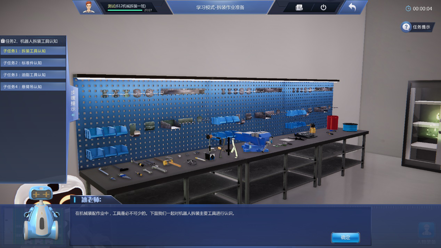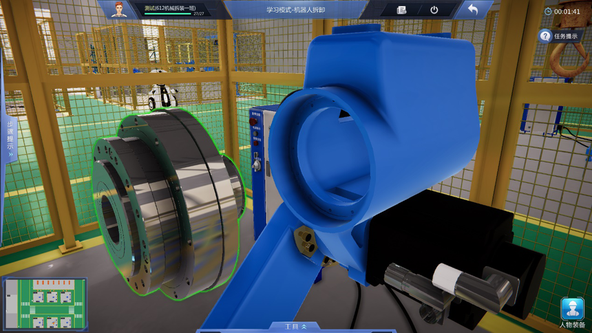 4、學(xué)習(xí)模式教學(xué)實(shí)訓(xùn)任務(wù)豐富:機(jī)器人拆裝作業(yè)準(zhǔn)備虛擬仿真實(shí)訓(xùn)項(xiàng)目包含拆裝作業(yè)防護(hù)準(zhǔn)備、機(jī)器人拆裝工具認(rèn)知、機(jī)器人拆卸作業(yè)準(zhǔn)備等至少3個(gè)教學(xué)實(shí)訓(xùn)任務(wù);機(jī)器人本體拆卸虛擬仿真實(shí)訓(xùn)項(xiàng)目包含機(jī)器人整體拆卸、機(jī)器人J6軸到J1軸的分步拆卸、諧波減速機(jī)的認(rèn)知、RV減速機(jī)的認(rèn)知等至少9個(gè)教學(xué)實(shí)訓(xùn)任務(wù);機(jī)器人本體安裝虛擬仿真實(shí)訓(xùn)項(xiàng)目包含機(jī)器人整體安裝、機(jī)器人J1軸到J6軸的分步安裝、機(jī)器人注油、軸承的認(rèn)知、軸的初步認(rèn)知等至少少10個(gè)教學(xué)實(shí)訓(xùn)任務(wù)。機(jī)器人初步調(diào)試項(xiàng)目包含調(diào)試前準(zhǔn)備、機(jī)器人開機(jī)、機(jī)器人關(guān)機(jī)、機(jī)器人基礎(chǔ)調(diào)試、機(jī)器人精度檢測(cè)等至少5個(gè)教學(xué)實(shí)訓(xùn)任務(wù)。