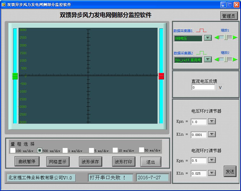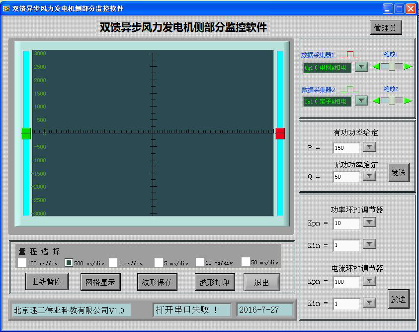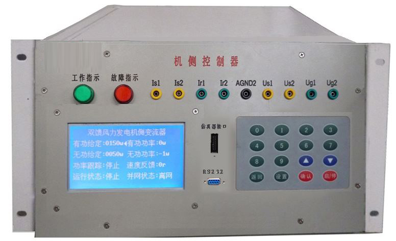 機(jī)側(cè)控制器的作用主要有兩個方面,一是給雙饋發(fā)電機(jī)的轉(zhuǎn)子提供勵磁分量的電流,從而可以調(diào)節(jié)雙饋發(fā)電機(jī)的定子側(cè)所發(fā)出的無功功率;二是通過控制雙饋發(fā)電機(jī)轉(zhuǎn)子轉(zhuǎn)矩分量的電流控制發(fā)電機(jī)的轉(zhuǎn)速或控制發(fā)電機(jī)定子側(cè)所發(fā)出的有功功率,從而使發(fā)電機(jī)運(yùn)行在風(fēng)力機(jī)的*佳功率曲線上,實(shí)現(xiàn)*大風(fēng)能追蹤(捕獲)運(yùn)行。機(jī)側(cè)控制器面板安裝有兩個信號指示燈,16鍵PVC軟鍵盤,240*128點(diǎn)蘭色液晶屏及9個波形測試端子。信號指示燈可對控制器工作、保護(hù)狀態(tài)分別指示;鍵盤可完成機(jī)側(cè)控制器啟動/停止設(shè)置,*大功率啟動/停止跟蹤設(shè)置,有功/無功給定,手動并網(wǎng)/離網(wǎng);液晶屏可顯示轉(zhuǎn)速反饋值,有功/無功反饋值;波形測試端子可通過示波器觀測發(fā)電機(jī)機(jī)轉(zhuǎn)子、定子相電流波形,可觀測發(fā)電機(jī)定子相電壓、電網(wǎng)相電壓波形。