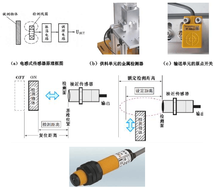 電感式接近開關是利用電渦流效應制造的傳感器。電渦流效應是指當金屬物體處于一個交變的磁場中,在金屬內部會產生交變的電渦流,該渦流又會反作用于產生它的磁場這樣種物理效應。如果這個交變的磁場是由一個電感線圈產生的,則這個電感線圈中的電流就會發(fā)生變化,用于平衡渦流產生的磁場。利用這一原理,以高頻振器(LC振蕩器)中的電感線圈作為檢測元件,當被測金屬物體接近電感線圈時產生了渦流效應,引起振蕩器振幅或頻率的變化,由傳感器的信號調理電路(包括檢波、放大、整形、輸出等電路)將該變化轉換成開關量輸出,從而達到檢測目的。電感式接近傳感器工作原理框圖如圖2-14 (a)