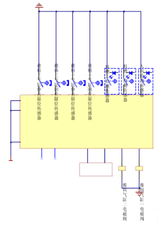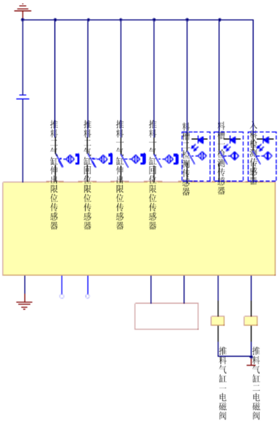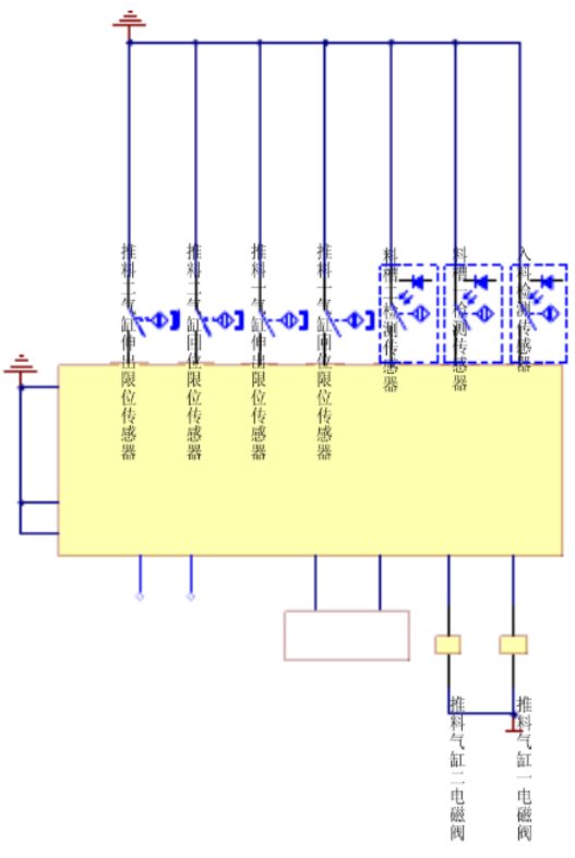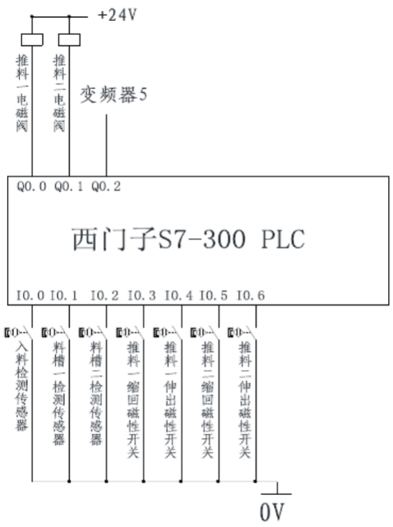 系統(tǒng)啟動(dòng),將物料放到光電傳感器前的皮帶上,當(dāng)光電傳感器檢測(cè)到有工件進(jìn)入,即給控制系統(tǒng)發(fā)出信號(hào),控制系統(tǒng)給變頻器發(fā)出啟動(dòng)信號(hào)。變頻器驅(qū)動(dòng)三相交流電機(jī)帶動(dòng)皮帶轉(zhuǎn)動(dòng),當(dāng)物料為金屬時(shí)電感傳感器檢測(cè)到信號(hào),變頻器停止,推料氣缸一動(dòng)作,將物料推入第一個(gè)料槽;當(dāng)物料為非金屬時(shí)電容傳感器檢測(cè)到信號(hào),變頻器停止,推料氣缸二動(dòng)作,將物料推入第二個(gè)料槽。
