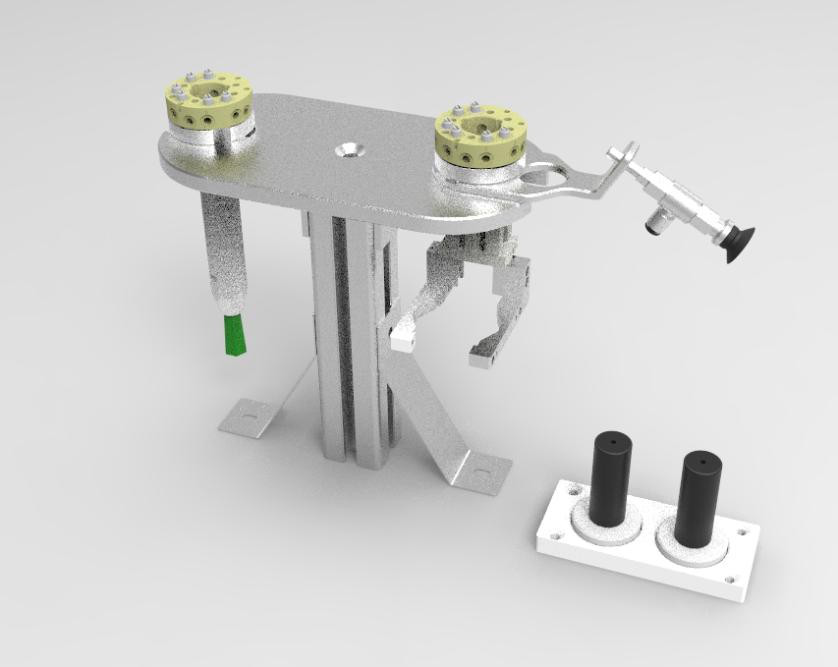 機器人末端工具是機器人的執(zhí)行單元,如圖 8 所示此模塊包括尖點輔助工具、筆工具、氣動夾爪工具和氣動吸盤工具。尖點輔助工具形狀為圓錐,具有TCP 校準(zhǔn)功能,同時可以模擬去毛刺、涂膠工具。筆工具、夾爪工具和吸盤工具都配備了機械快換工具,與機器人法蘭盤的機械快換工具配套使用,可實現(xiàn)工具的快速更換。筆工具內(nèi)部設(shè)置有緩沖裝置,可以有效減少學(xué)生初步學(xué)習(xí)機器人操作時,由于不熟練導(dǎo)致剛性碰撞產(chǎn)生對工具的損壞。筆工具可以完成軌跡、寫字和繪畫等實驗內(nèi)容,彩筆可快速更換。夾爪工具和吸盤工具采用國際知名品牌, 用于物料的抓取和吸附。