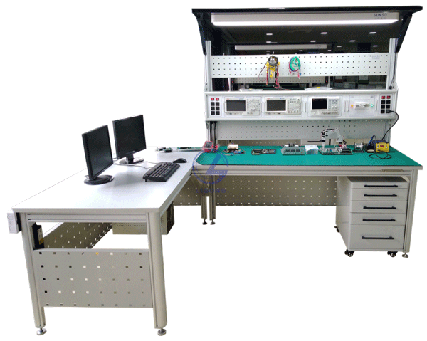 1.工作臺:桌身采用優(yōu)質鋁型材做骨架,整機既堅固耐用,美觀大方。桌面采用25mm厚高密度纖維板,外貼防火板,PVC截面封邊,具有耐磨、耐熱、耐污、耐火、耐菌、防霉、抗靜電及易清潔等特點。工作臺設有防靜電配套裝置,桌面上方有實訓屏、模塊盒安放橫梁、工具網(wǎng)孔板、高檔條形LED照明。