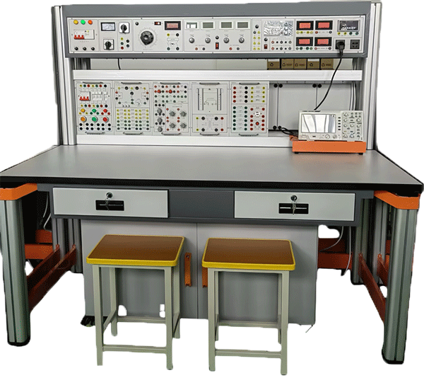 裝置由主機箱、實驗桌、實訓掛箱、獨立封裝實訓電路模塊、移動矮柜、示波器架、學生凳等組成。實訓裝置支架與實訓桌可組合、可拆裝。支架與桌腳一體,鋁合金結構,實訓掛箱、各實驗模塊可根據實驗需求自由組合放置。