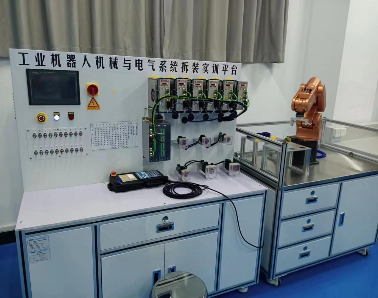 實(shí)驗(yàn)設(shè)備可反復(fù)實(shí)訓(xùn)使用,將機(jī)器人的電氣控制柜進(jìn)行整體拆除做成一個(gè)獨(dú)立的工業(yè)機(jī)器人電氣拆裝系統(tǒng)模塊。具體做法為鋁型材搭建,兩側(cè)和底部鈑金封板,為伺服電機(jī)、示教器、功能模塊等部件的安裝提供標(biāo)準(zhǔn)的安裝接口,預(yù)留有標(biāo)準(zhǔn)電氣接口安裝位置,可根據(jù)模塊的使用情況進(jìn)行功能的擴(kuò)展,同時(shí)為各功能模塊提供穩(wěn)定的電源。