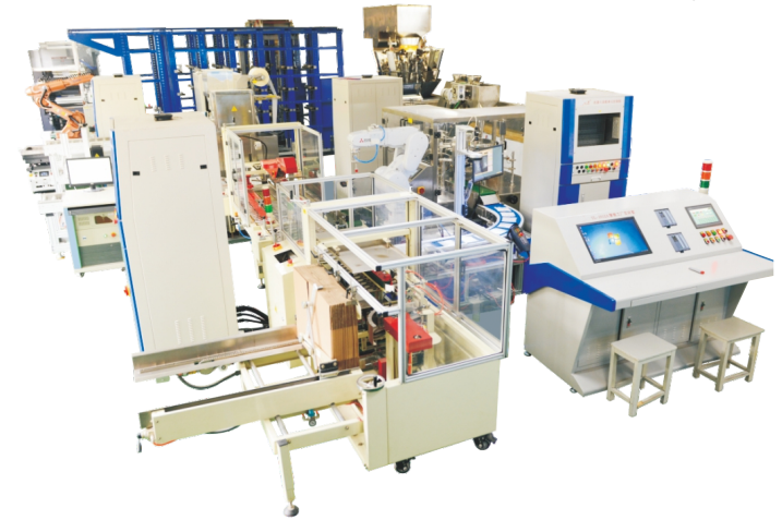 LGY-ZN012A型智能工廠實(shí)訓(xùn)室由控制系統(tǒng)(PLC)、制造執(zhí)行系統(tǒng)(MES)、資源管理系統(tǒng)(ERP) 三層結(jié)構(gòu)組成,主要由PLC控制、顆粒包裝、液體包裝、工業(yè)機(jī)器人裝配、紙箱成型機(jī)、封箱機(jī)、激光打碼、貼標(biāo)、掃碼器、工業(yè)機(jī)器人倉(cāng)儲(chǔ)搬運(yùn)、巷道式倉(cāng)儲(chǔ)、吹膜單元、印刷單元、制袋單元、行走工業(yè)機(jī)器人搬運(yùn)、AGV、RFID、掃碼定位、激光測(cè)距、氣動(dòng)元件等組成。