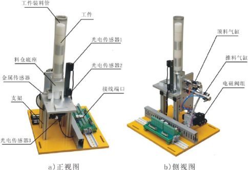 主要由井式工件庫、推料氣缸、物料臺、光電傳感器、磁性開關(guān)、電磁閥、支架、機械零部件構(gòu)成。