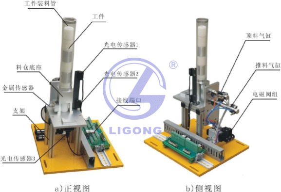 主要由井式工件庫(kù)、推料氣缸、物料臺(tái)、光電傳感器、磁性開關(guān)、電磁閥、支架、機(jī)械零部件構(gòu)成。