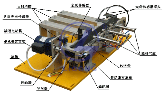 主要由井式供料單元、三工位旋轉(zhuǎn)工作臺(tái)、平面軸承、沖壓裝配單元、光電傳感器、電感傳感器、磁性開關(guān)、電磁閥、直流電機(jī)及驅(qū)動(dòng)繼電器、支架、機(jī)械零部件構(gòu)成。