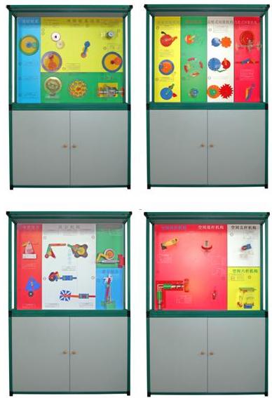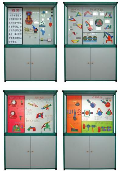 本設備是根據大中專院校、職業(yè)學校的教學大綱設計的機械陳列柜,《機械基礎》電化教學設備。陳列柜共分十個柜和一個電腦控制臺,進行多媒體聲控同步解說演示。由PC機電腦控制順序或任選運行每個柜模型動作,同時電腦播放圖像或三維動畫同步模型動作。