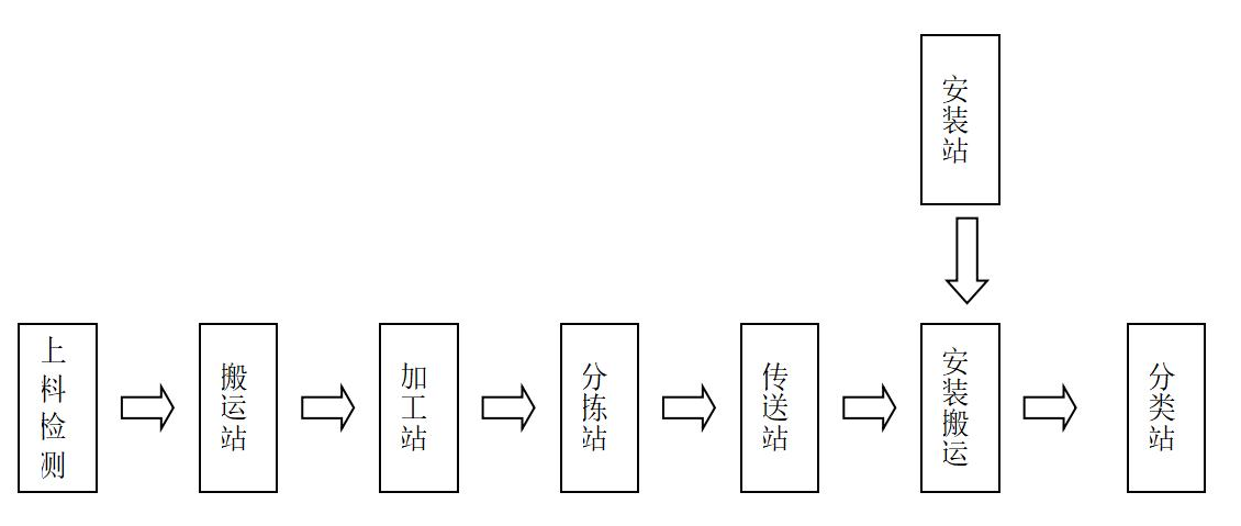 下圖給出了系統(tǒng)中工件從一站到另一站的物流傳遞過程:上料檢測單元將大工件按順序排好后提升送出;搬運站將大工件從上料檢測單元搬至加工站;加工站將大工件加工后送出工位;分揀站將加工過的正常的工件搬運到傳送站,如果是廢料,分揀機(jī)械手將工件搬運到廢料處理機(jī)構(gòu);傳輸站將正常的大工件送至尾端,將廢料分揀到廢料槽里;安裝搬運站將大工件從傳輸站搬至安裝工位放下。安裝站再將對應(yīng)的小工件裝入大工件中。而后,安裝搬運站再將安裝好的工件送分類站,分類站再將工件送入相應(yīng)的料倉。