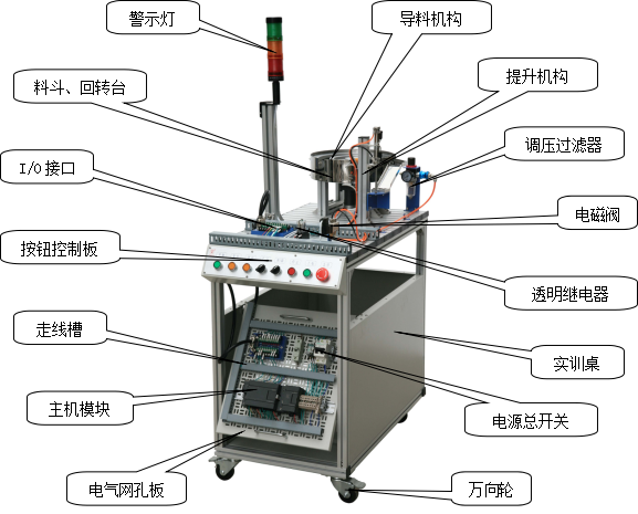 由料斗、回轉(zhuǎn)臺、導(dǎo)料機(jī)構(gòu)、平面推力軸承、工件滑道、提升裝置、檢測工件和顏色識別光電開關(guān)、開關(guān)電源、可編程序控制器、按鈕、I/O接口板、通訊接口板、電氣網(wǎng)孔板、直流減速電機(jī)、電磁閥及氣缸組成,主要完成將工件從回傳上料臺依次送到檢測工位,提升裝置將工件提升并檢測工件顏色。