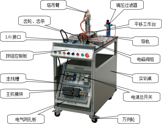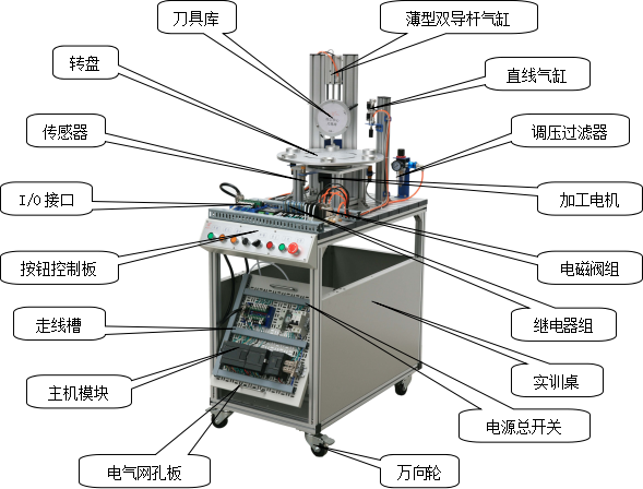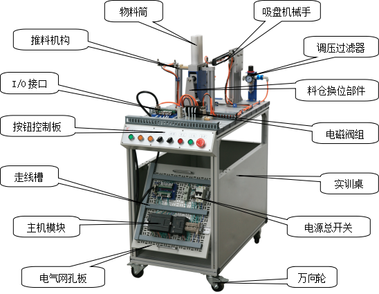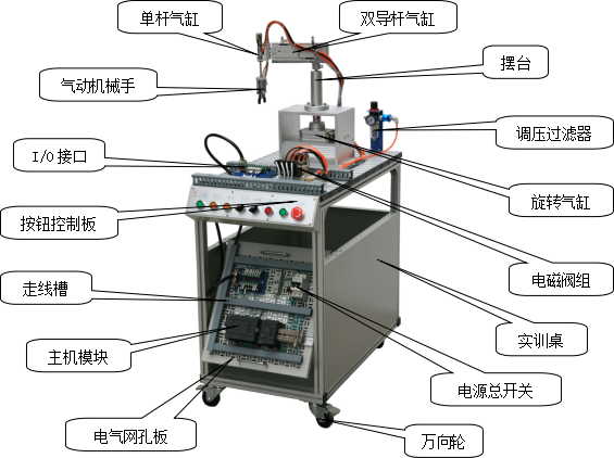 該系統(tǒng)上使用了大量的氣動元件,包括多種電控氣動閥、多種氣動缸、氣動夾爪、真空吸盤、真空發(fā)生器、過濾減速閥等。在學(xué)習(xí)這些氣動元件時,不但可以單獨學(xué)習(xí)每一種分離元件,而且還可以在學(xué)習(xí)時了解各種氣動元件之間,以及氣動元件與其它元件之間,如何配合起來并協(xié)調(diào)進(jìn)行工作的。