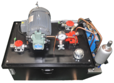 液壓泵站由三相電機(jī)、變量葉片泵、單向閥、風(fēng)冷器、空氣濾清器、油溫油面計(jì)、精密過(guò)濾器、壓力表、蓄能器、泄壓閥組等組成。