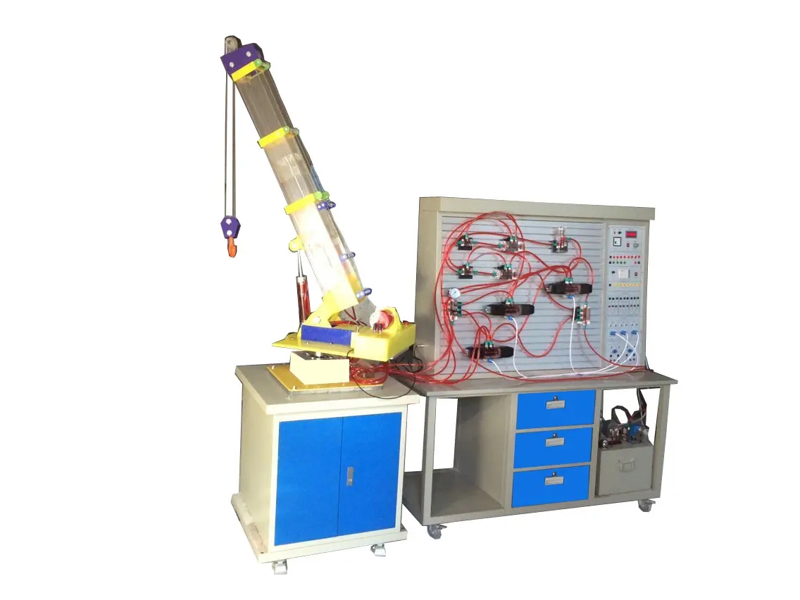 3、透明起重機液壓實訓(xùn)臺可模擬真實起重機工作裝置的各種動作。液壓系統(tǒng)采用進(jìn)口透明機玻璃液壓元件、透明尼龍軟管搭接而成,液壓元件結(jié)構(gòu)、工作原理,液壓回路工作原理一目了然。整個實訓(xùn)臺具有形象、直觀、方便、可靠等優(yōu)點。