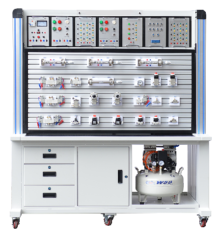 本實訓(xùn)裝備,由氣動元件部分、電氣控制部分及實訓(xùn)臺架等組成,電氣部分主要由PLC模塊、繼電器模塊、電源模塊、按鈕模塊等部分組成。實訓(xùn)臺主體框架采用鋁木結(jié)構(gòu)組裝完成,臺架重量較輕且安裝了萬向輪,可方便實訓(xùn)臺的移動。臺架分上下兩層結(jié)構(gòu),上面可放置電氣模塊,下面是實訓(xùn)屏,實訓(xùn)屏采用帶槽鋁合金結(jié)構(gòu),方便各氣動元件的安裝和拆卸,學(xué)生可以根據(jù)實驗需要在實訓(xùn)屏上任意搭建氣動回路,組成具有一定功能的氣動系統(tǒng)。實訓(xùn)臺采用模塊式結(jié)構(gòu),便于組合與擴展,提高了設(shè)備空間的利用率。