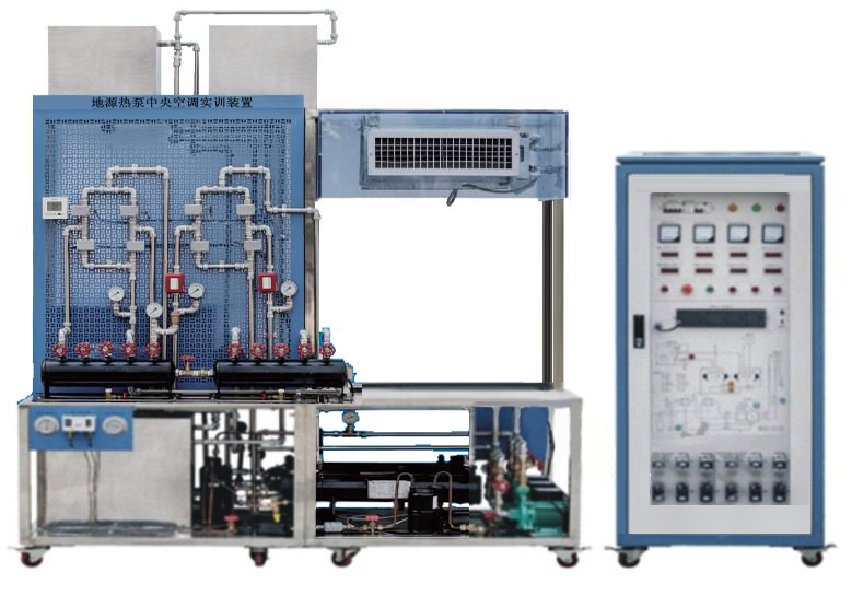 地源熱泵空調系統(tǒng)由制冷機組、模擬水井、空調系統(tǒng)、生活衛(wèi)生供水系統(tǒng)、控制系統(tǒng)、實訓臺等組成。實訓臺采用不銹鋼底架結構,結構堅固,造型美觀大方;桌面用于安裝電源控制屏并提供一個寬敞舒適的工作臺面。