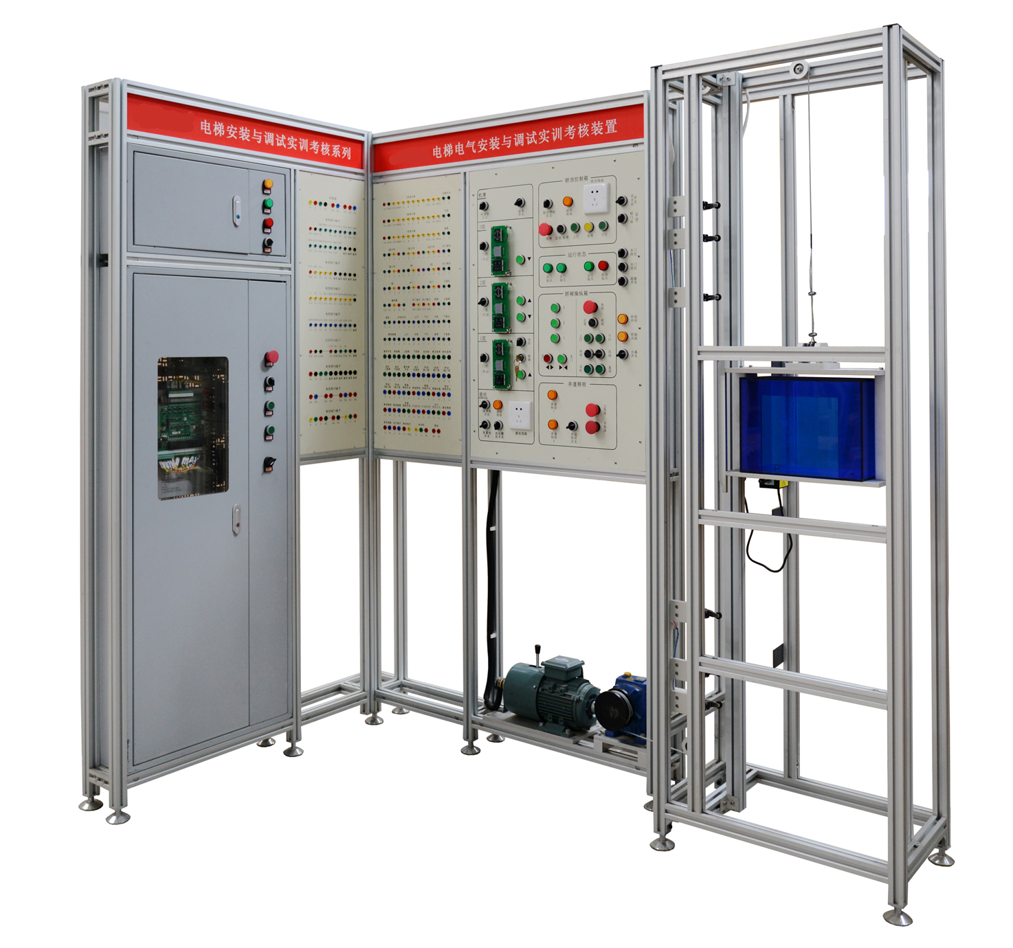 1、電梯電氣安裝調試實訓考核裝置采用了“L”形支架結構能夠減少占地面積,同時多臺并排布置時能夠形成實訓室工位式布局;