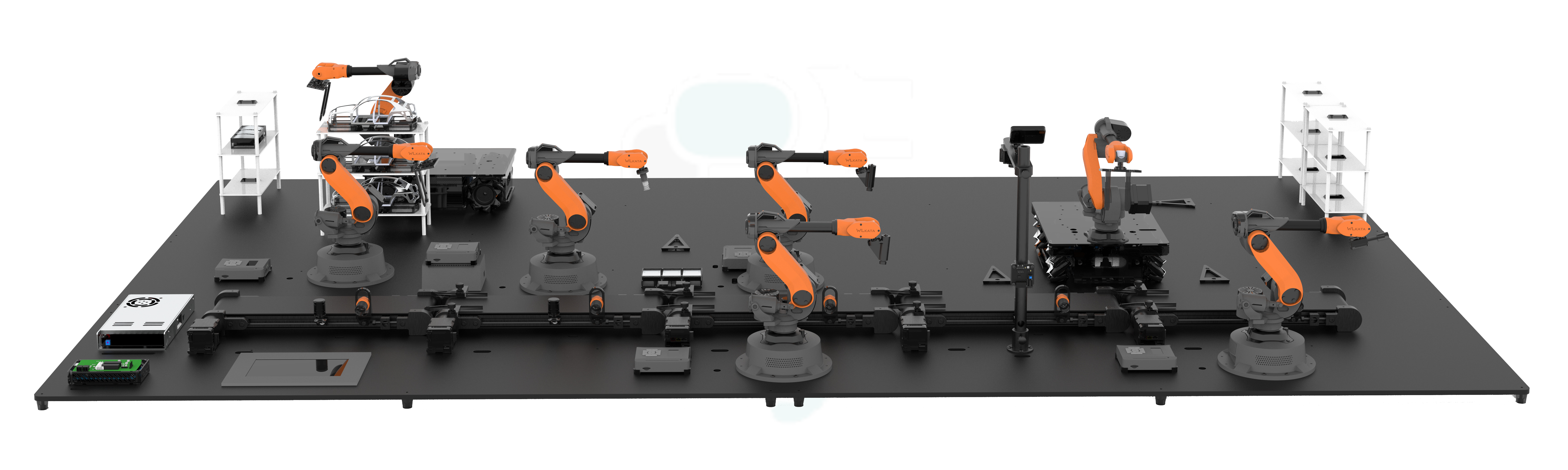 桌面六軸機器人*5;復合移動機器人*2;AI視覺套件*1;傳送單元*5;人機交互屏*1;配件包*1