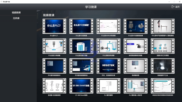 (6)具有PLC知識學(xué)習(xí)庫,能夠在線進行PLC知識學(xué)習(xí)。PLC的知識學(xué)習(xí)庫包括視頻資源和三維電氣元件庫。
