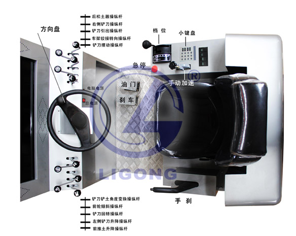 ◆檔位調(diào)節(jié)與功能控制: 平地機(jī)模擬機(jī)與真機(jī)完全相同的多種不同檔位,可實(shí)現(xiàn)前進(jìn)、后退功能,與真機(jī)相同。