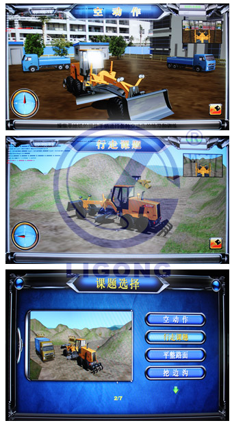 7.基礎(chǔ)訓(xùn)練模式:平地機(jī)模擬機(jī)可滿足設(shè)備基礎(chǔ)規(guī)范操作的要求,可實(shí)現(xiàn)各種轉(zhuǎn)向、行走、鏟刀運(yùn)動(dòng)、松土平整、鏟斗運(yùn)動(dòng)以及施工作業(yè)的逼真模擬。